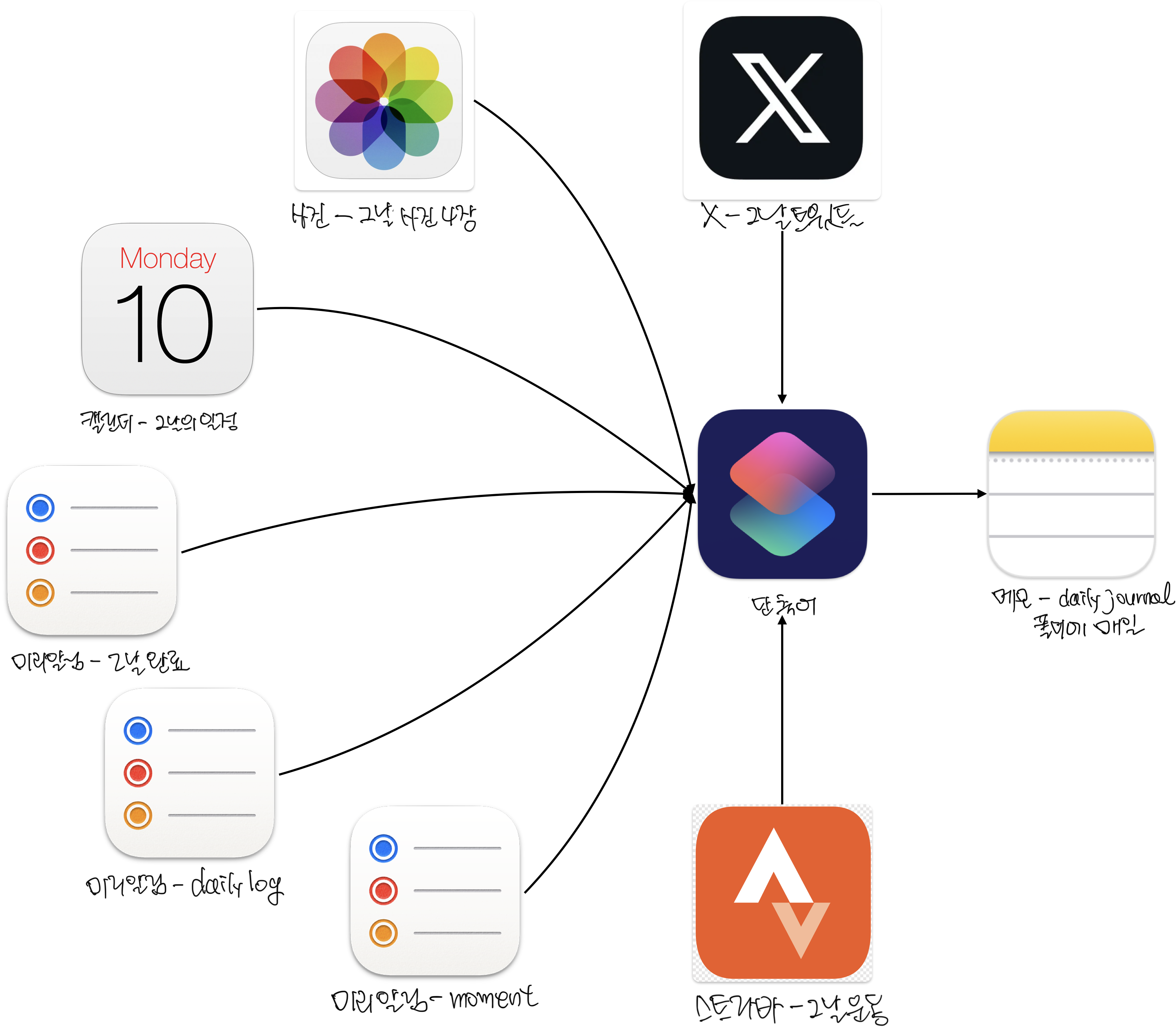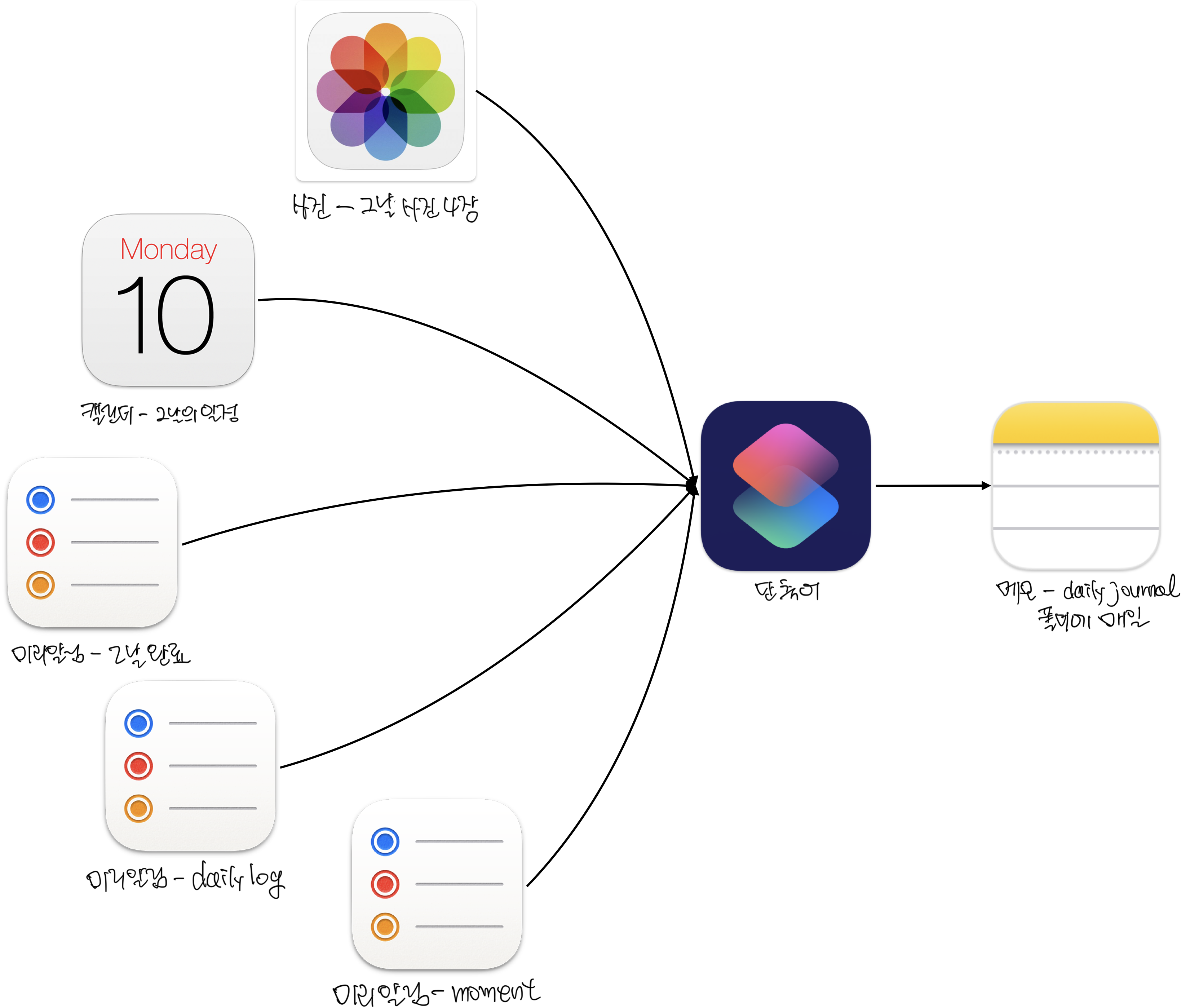 소람님 단축어는 미리알림 뿐 아니라, 사진 앱에서 그날의 임의 사진 4장과, 캘린더 일정까지 가져온다. 이를 그림으로 그려보면,