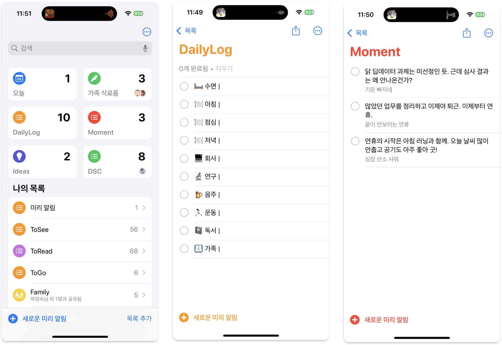 그러다보니, "미리알림"이 내가 제일 많이 쓰는 앱이 되었다. 잠시 내 미리알림 목록을 소개하면, 가족끼리 공유하는 "Family"가 있고, 회사 팀원과 공유하는 "DSC"가 있다. 블로그 쓸 꺼리 등 새로운 아이디어는 "Ideas"에, 보고 싶은 영화, 읽고 싶은 책, 가고 싶은 곳은 각각 ToSee, ToRead, ToGo에 적는다. 소람님의 단축어는 그날 일과인 "Daily log"와 "Moment"를 자동으로 그날 일기로 기록한다. 나는 미리알림 목록이 많다보니 "To do" 목록 대신에 다른 모든 목록을 대상으로 변경했다. 그리고, 순간의 기록인 "Moment"에는 작성 시간이 나오도록 추가했다.