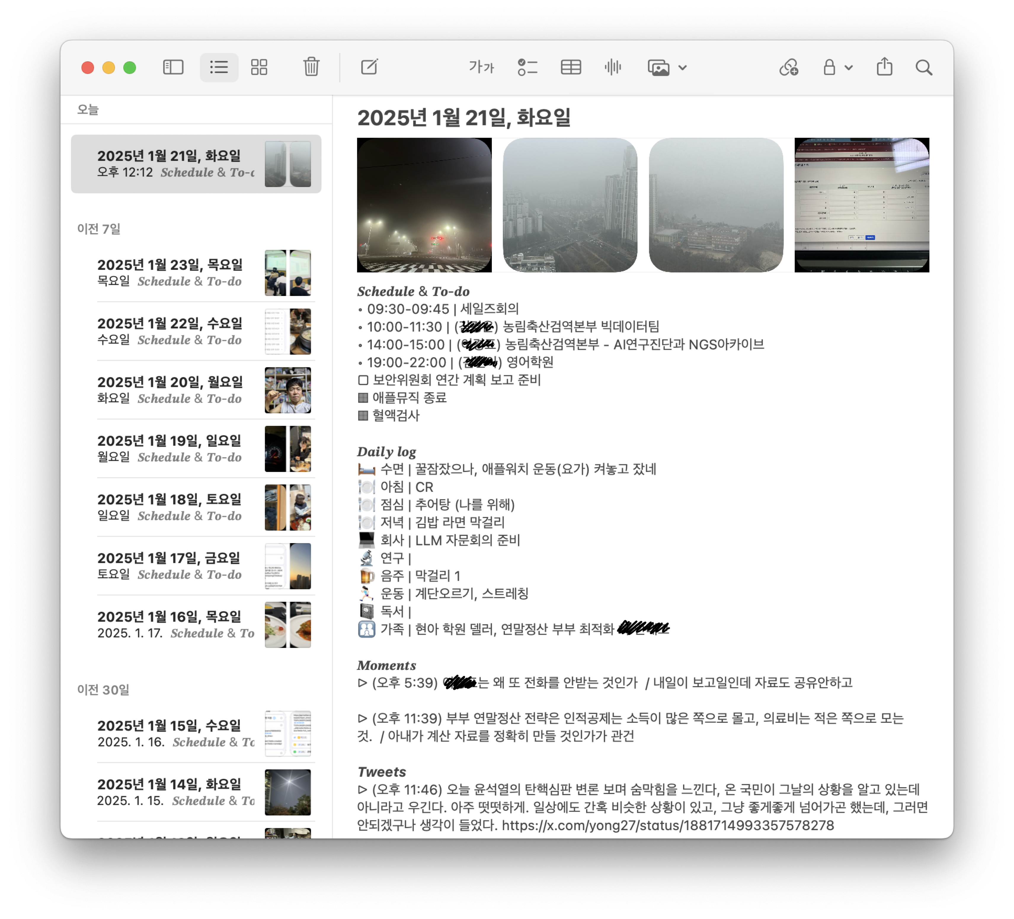기왕이면, 그날의 X(트위터) 트윗들도 가져오면 좋을텐데 하고 "X API v2로 오늘의 내 트윗들을 가져오는 아이폰 단축어"를 만들고는 자동일기 단축어에 포함시켰다. 이렇게 하여 자동으로 만들어진 일기들을 잠깐 보여주면,