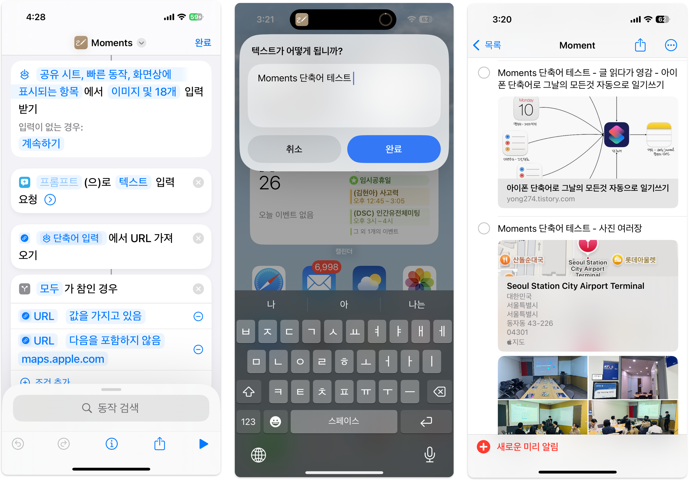 그런데, 앞서 얘기한 "순간의 영감"을 기록하는 용도인 미리알림의 "Moment" 항목에 뭔가 쓰려면 다소 불편하다. 미리알림 켜서 "Moment"에 들어가서 직접 새 항목을 써야 하고, URL이나 사진을 붙혀넣기가 까다롭다. 이래가지고는 그 영감이 다 날아가 버릴 수도 있다. 하여, 쉽게 순간을 기록하는 용도의 단축어도 따로 만들었다. (Moments 단축어 다운로드)