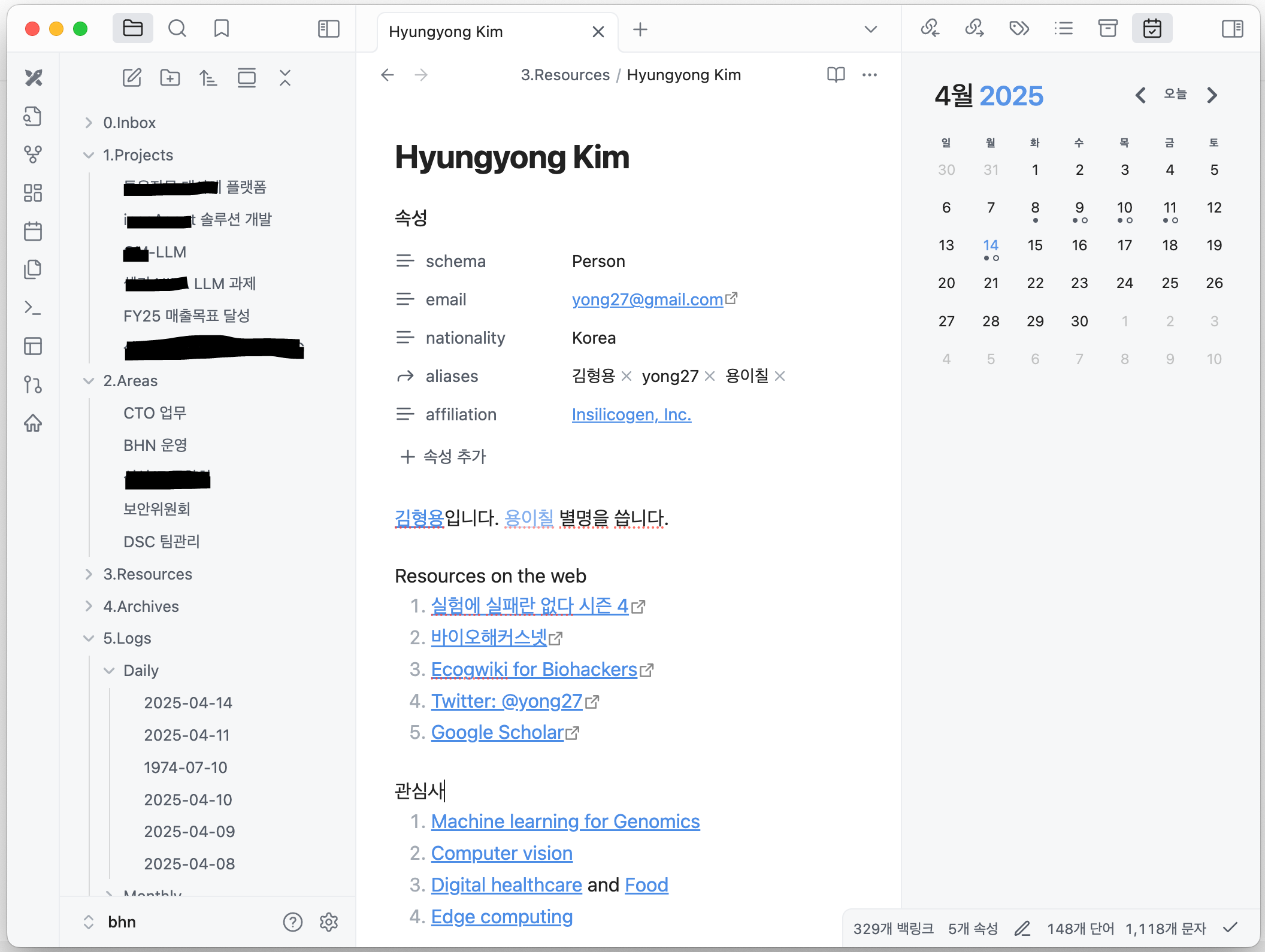 20여년전 위키위키를 처음 접하고, 내주변의 모든 것들, 내가 공부하는 모든 것들을 위키에 담으로고 노력했다. 바이오해커스넷을 만들고, Ecogwiki for Biohackers 사이트를 운영하면서, 위키를 통한 지식 구조화는 어렵겠지만 언젠간 될꺼고, 그때를 위해 하나하나 최선을 다해 정리했다. 하지만 점점 노력의 성과를 못보며 동력이 줄었고, 그러다 구글 클라우드 플랫폼 (GCP) 과도한 비용 청구 문제로 현실적인 대안을 찾았다. 그러던중 팀 동료로부터 옵시디언(Obsidian)을 추천받았다. 아, 전에 X 타임라인에서 본적있어!
