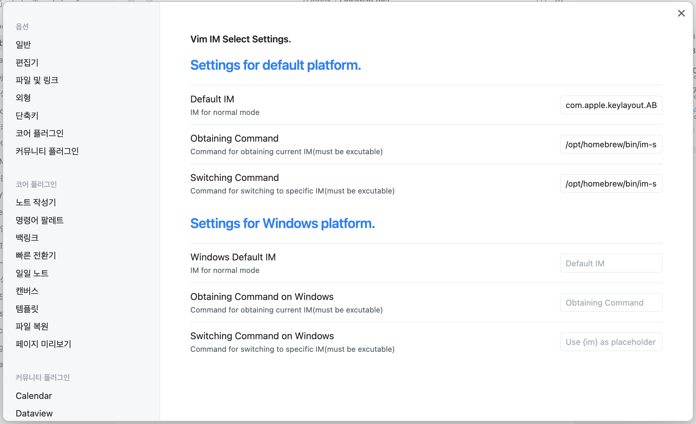 - Obtaining Command: 현재 사용중인 입력기를 얻기위한 명령어를 입력한다. 좀전에 기억한 "/opt/homebrew/bin/im-select"를 입력한다.