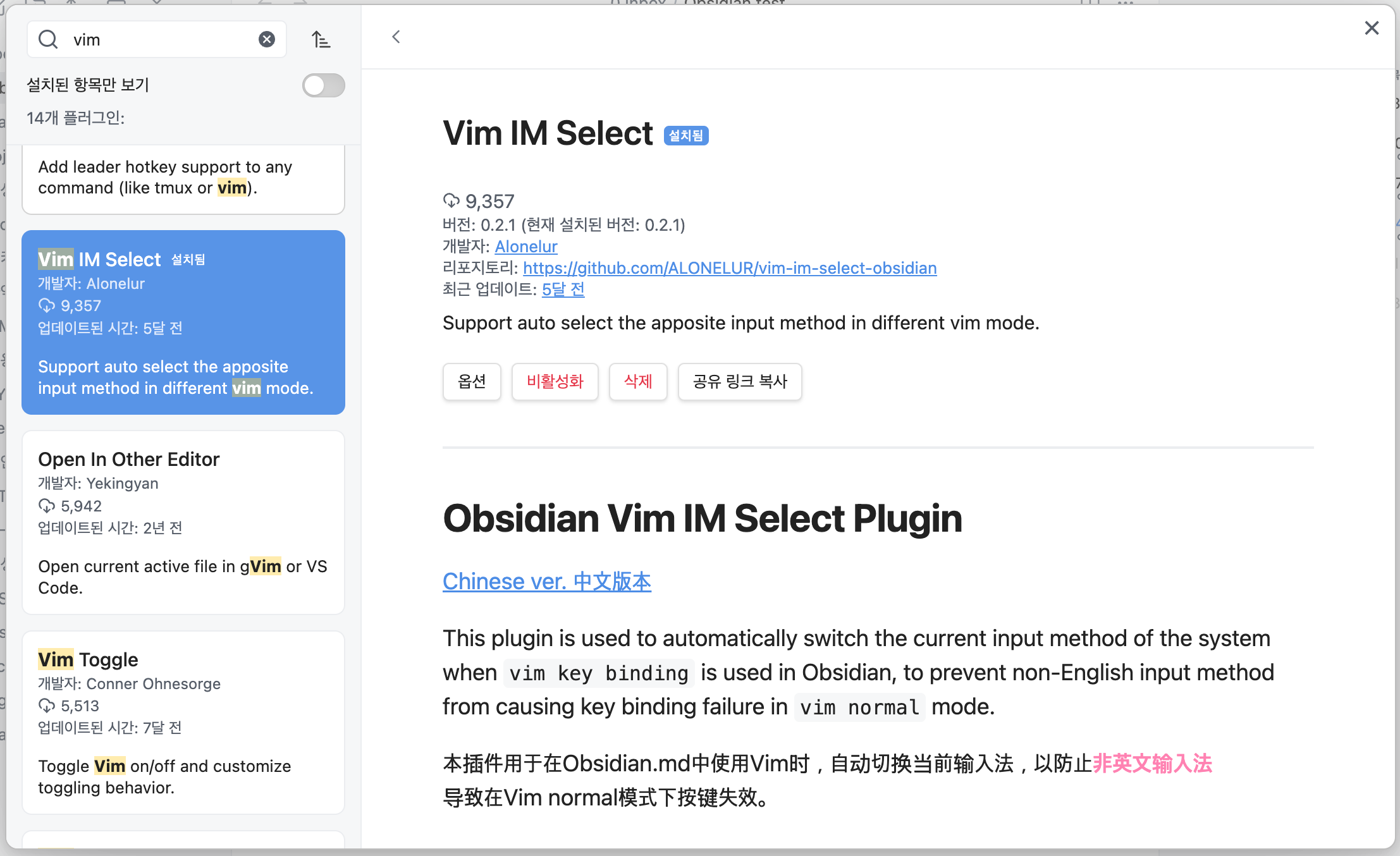 옵시디언 커뮤니티 플러그인에서 obsidian-vim-im-control을 찾아서 설치하고 활성화한다.